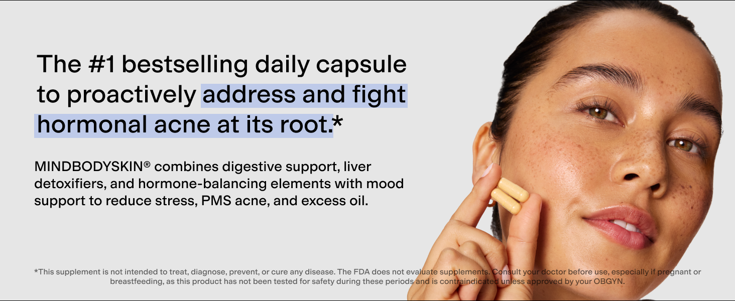 #1 bestselling daily capsule to proactively address and fight hormonal acne at its root.* MINDBODYSKIN®2 available without 5-HTP.